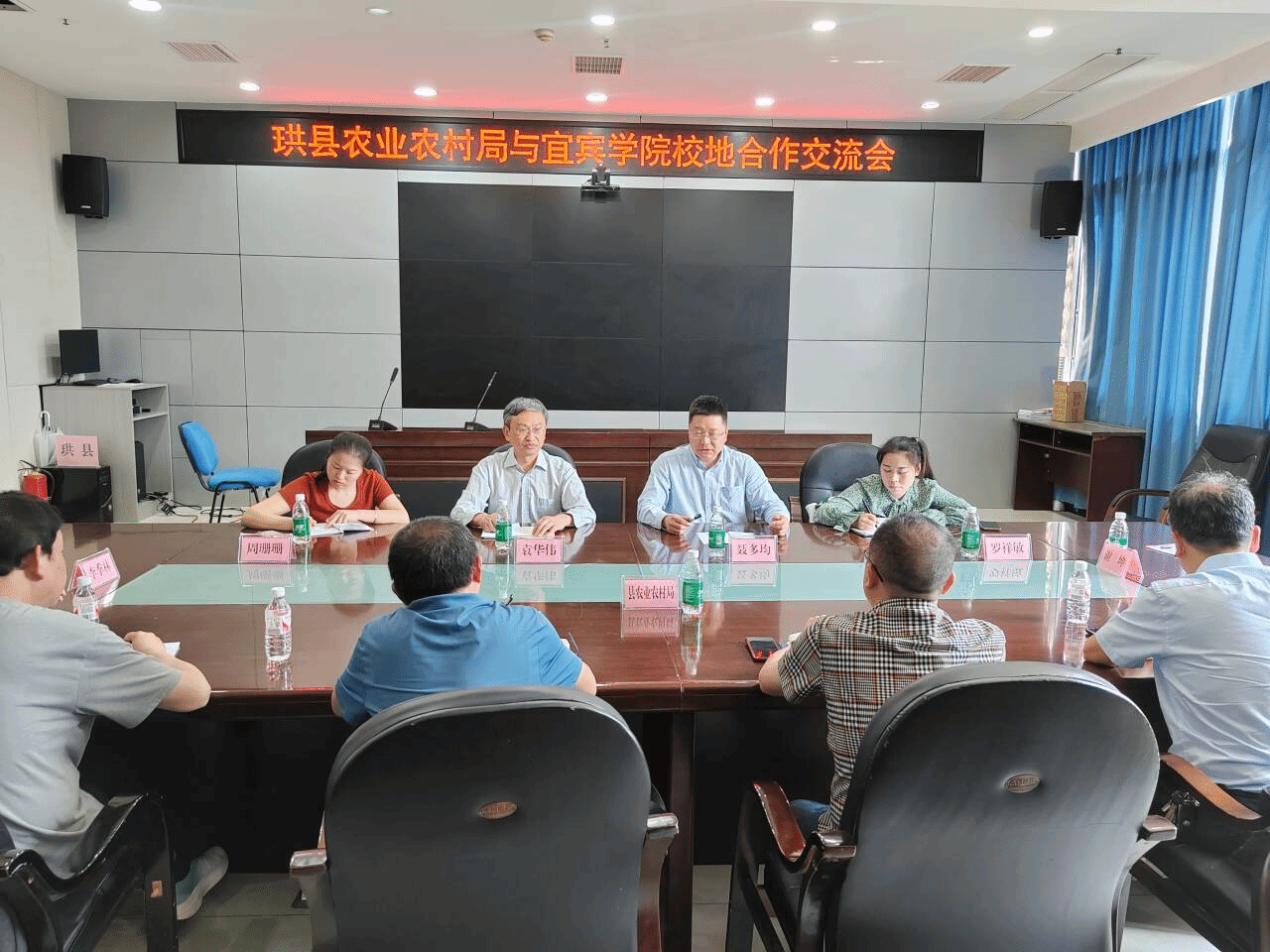 调研结束后,一行与珙县农业农村局开展校地合作座谈会。会上,聂多均介绍了学部的专业特色、科研优势以及人才培养模式,并表示希望通过校地合作,将学校的智力资源与地方产业发展需求相结合,为企业解决技术难题,为地方培养高素质应用型人才。珙县农业农村局党组成员饶冬银对一行的到来表示欢迎,介绍了珙县农业产业发展现状及面临的问题,希望借助宜宾学院的专业优势,在技术研发、人才培养、成果转化等方面开展深度合作,共同推动珙县农业产业转型升级。双方还就合作的具体项目、方式和机制进行了深入探讨,并达成初步合作意向。
