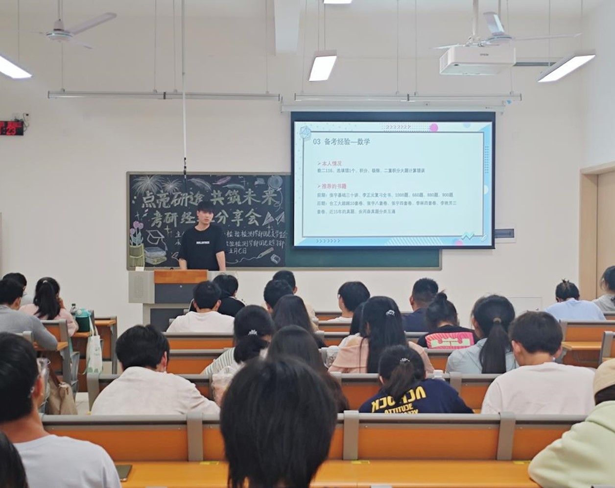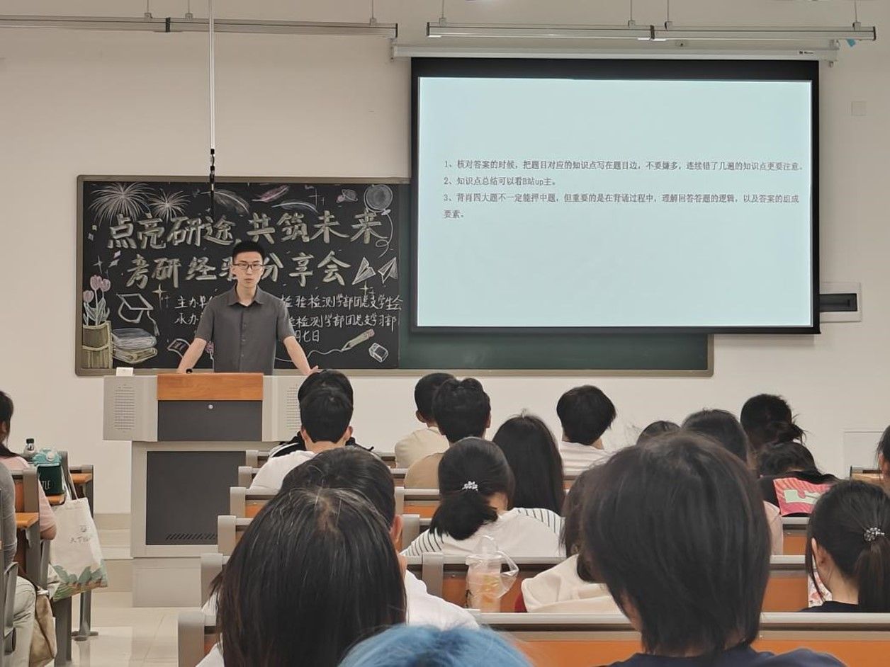 为了帮助在校学生明确考研目标,掌握备考技巧。5月7日晚,质量管理与检验检测学部团委在临港校区三号楼213教室开展“点亮研途,共筑未来”考研经验分享会活动。质检学部赖东京、孙牟瑶、陈伽铭、邵羿志、周鹏、刘梓淇六名同学进行了经验分享交流。