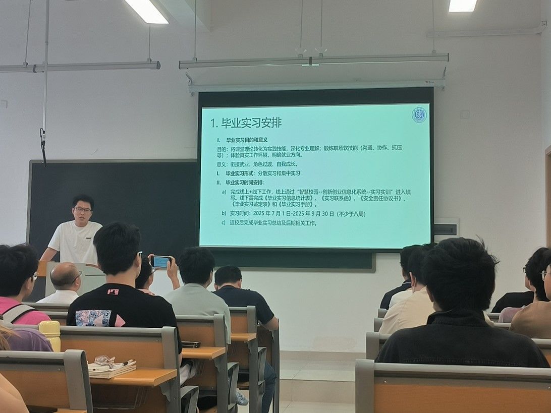 会议伊始,范厚江主任作毕业实习动员讲话,从毕业实习在人才培养体系中的重要地位出发,强调实践与理论结合的关键作用,要求全体学生明确实习目标,端正实习态度,以积极主动的姿态认真参与各项实习工作。同时,范主任就实习纪律、职场礼仪、安全保障及实习记录等方面提出了具体要求,为学生实习过程提供了指导方向。