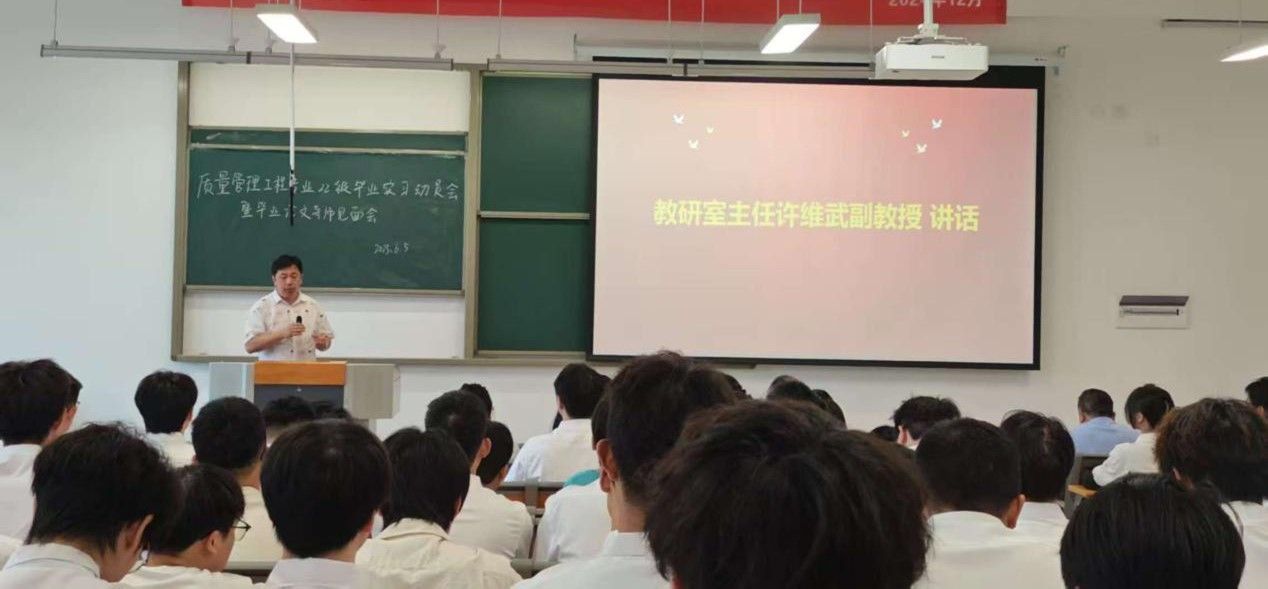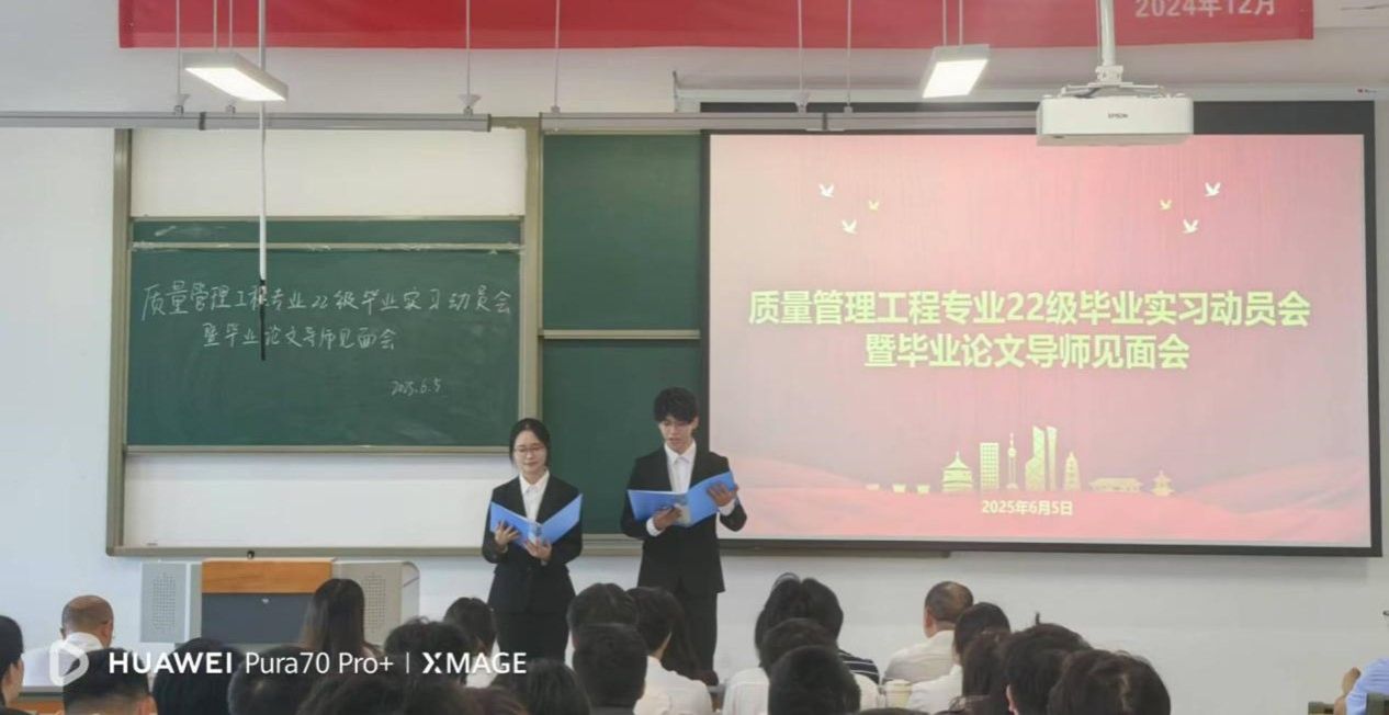 为切实推进 2026 届毕业生实习工作有序开展,助力学生将理论知识与实践技能深度融合,6月5日中午,学部质量管理工程专业22级毕业实习动员会暨毕业论文导师见面会在质检大楼208教室顺利举行。学部副部长邓月华、质量管理工程教研室主任许维武及全体 22 级毕业论文导师、学生共同参与了本次活动。主持人为质量管理工程22级刘汉兵、杨敏。