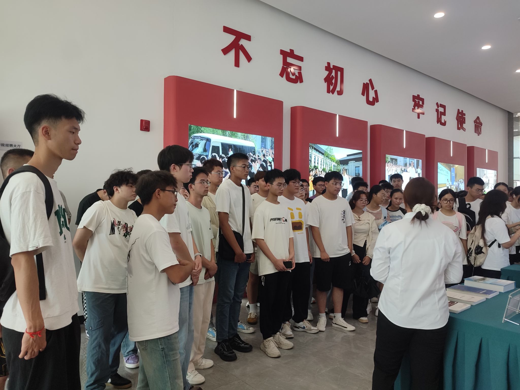 在求实会堂,讲解员分班带领同学们循着总书记的足迹,重温动人场景,重点参观了总书记曾关注的毕业生就业情况电子屏、模拟垃圾智能分类运输机器人展台、智慧农业物联网监控系统、油樟萃取精馏装置展区、就业创业指导服务展区及招聘会会场。通过身临其境的参观学习,同学们深刻领会了习近平总书记重要指示精神的核心要义。