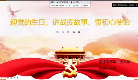 为充分发挥学部基层党组织的战斗堡垒作用和党员先锋模范作用,让党旗始终在防控一线高高飘扬,激励和引领广大学生党员弘扬爱国主义精神,质量管理与检验检测学部学生党支部于2020年7月7日下午14:30分组织召开“迎党的生日、讲战役故事、悟初心使命”组织生活会。本次组织生活会通过网络在线开展,学生党支部组织部部长谷雨婷同志主持,质量管理与检验检测学部学生支部书记罗祥敏同志及全体学生党员参加本次会议。