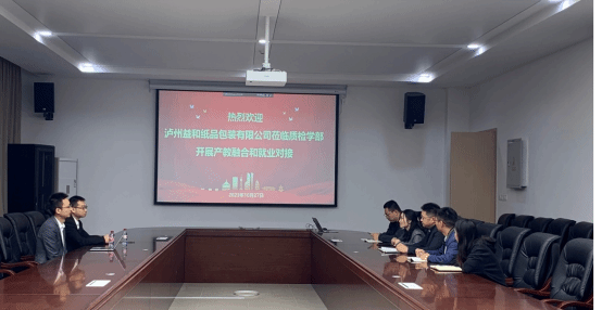 为进一步深入学习贯彻落实党的二十大精神和习近平总书记来川来宜来校视察重要指示精神,进一步推进产教深度融合、挖掘岗位资源、拓展毕业生就业渠道,10月27日,质量管理与检验检测学部特邀请四川郎酒股份有限公司全资子公司泸州益和纸品包装有限公司(以下简称泸州益和)质量管理部长尹进、行政人事部副部长黄兵、行政人事综合事务员雷衡一行来校开展产业融合和就业对接工作。质检学部党总支书记聂多均、副部长(负责工作)朱盛艳、副部长赵品瑶及相关教师参会。会议由聂多均主持。