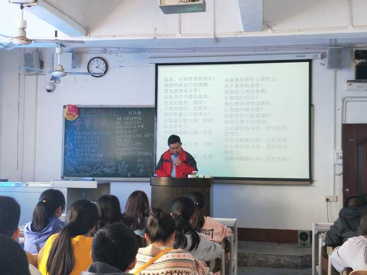 本次开学典礼分为四个流程。首先,全体起立唱《国际歌》,然后进行了动员讲话。书记对本期的入党积极分子表示欢迎并对他们提出了期望与要求。希望他们认真学习培训教材、党章、党的精神以及党的思想;要了解党的发展历史,信仰党,拥护党;要有积极向上的心态,拒绝反对不利于党的发展的言论以及活动。由党校张利老师致辞,对新一期积极分子学员表示欢迎与期望,并讲述了党校学习的要求、规定。再由本期入党积极分子代表兰金燕同学讲话。表明了积极向上的入党动机,为党奉献,为人民服务的决心。
