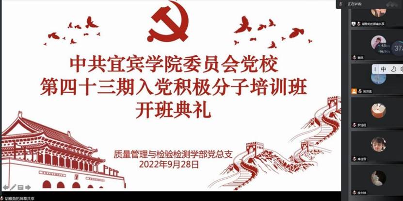 28日下午,质量管理与检验检测学部党总支在腾讯会议上举行了第四十三期入党积极分子培训班开班典礼。学部党总支正处级组织员闵军教授、党校班主任、学生党支部书记、第四十二期入党积极分子优秀学员代表及第四十三期入党积极分子全体学员参会。