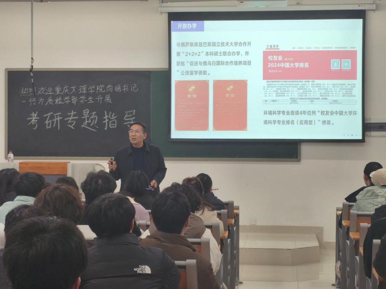 为助力学生明晰考研方向,做好学业规划,3月11日下午,重庆文理学院化学与环境工程学院党委副书记、纪委书记、副院长谢云成在学部218教室为2022级环境工程专业学生开展考研专题指导。此次活动聚焦考研升学,旨在为学生提供专业指导与建议,帮助学生深入了解考研形势与重庆文理学院资源与环境专业硕士点情况。