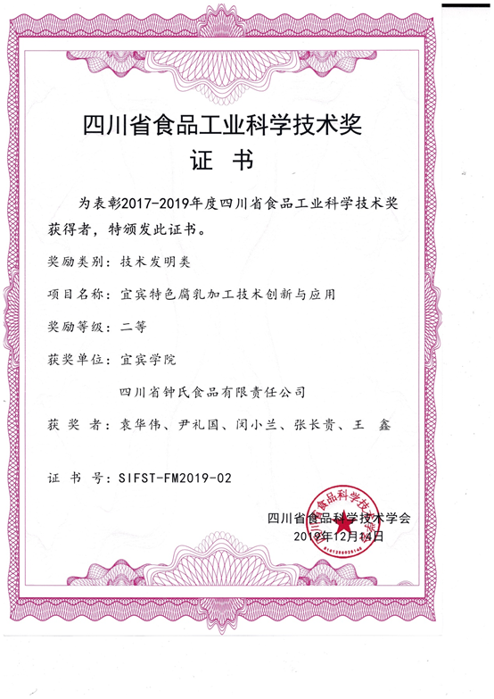 此次大会对2017-2019年度四川省食品工业科学技术奖及优秀论文进行了表彰。由袁华伟、尹礼国、张长贵、王鑫团队组织申报的“宜宾特色腐乳加工技术创新与应用”获得2017-2019年度四川省食品工业科学技术奖技术发明类二等奖。