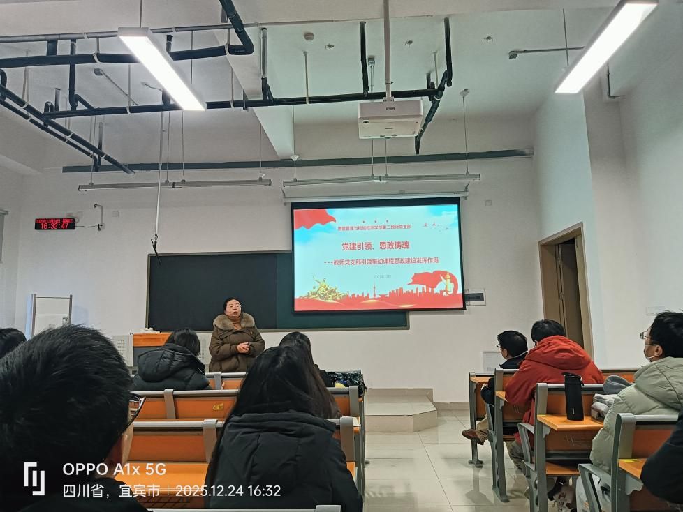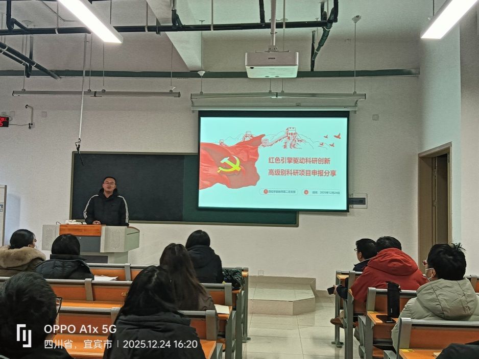 为深入贯彻新时代党的建设总要求,充分发挥基层党支部的战斗堡垒作用和党员教师的先锋模范作用,推动党建与业务工作深度融合,2025年12月24日,宜宾学院质量管理与检测检验学部第二教师党支部举办了一场主题鲜明、内容丰富的专题分享会。会议聚焦“红色引擎驱动科研创新”与“党建引领课程思政建设”两大核心议题,由支部委员雷刚同志与党支部书记李莉同志分别作专题分享。