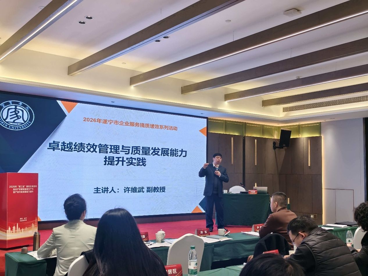 为深入服务地方经济发展,促进产学研用深度融合,2026年1月27日,学部质量管理工程专业负责人许维武副教授应遂宁市经济和信息化局邀请,赴遂宁市参加了“2026年遂宁市企业服务提质增效系列活动——知识产权赋能新质生产力暨产业升级质量能力提升”专题活动,并作为主讲专家及专家服务团成员,开展了主题演讲与企业走访调研。