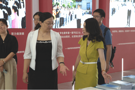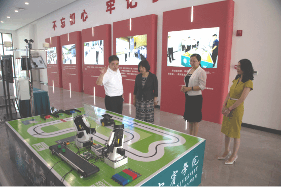 一行人员前往求实会堂参观学习,周广均向调研人员传达了习近平总书记来校视察重要指示精神,介绍了学校毕业生就业、模拟垃圾智能分类运输机器人获奖、“质量与标准化”特色发展等情况。