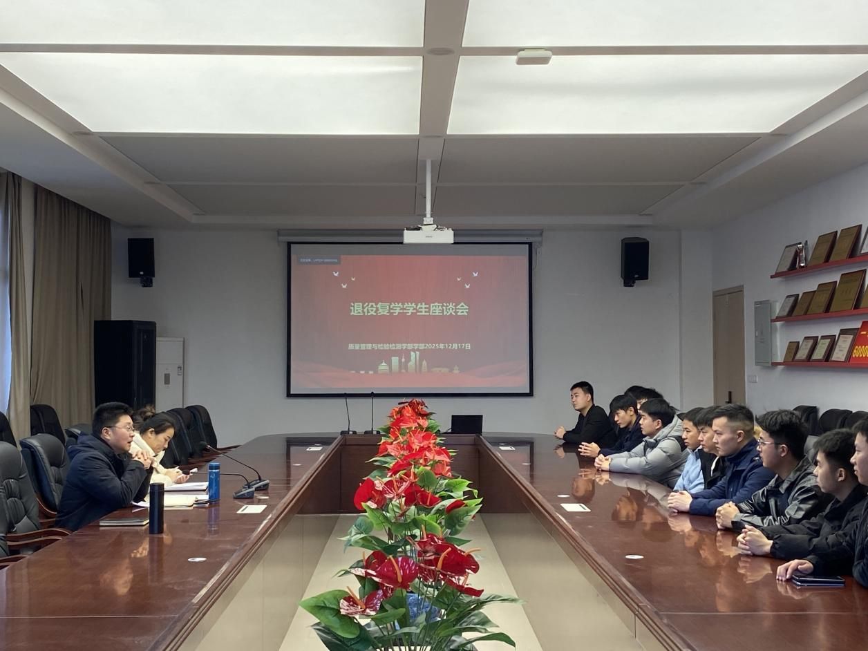 会上,聂多均详细了解了学生们入伍与退役时间、家庭状况、学业进展等基本情况,并就学习、生活及校园适应等方面与同学们展开交流。他特别询问了大家对退役复学相关优惠政策的了解程度、毕业后的规划以及是否有考研意向。同学们普遍反映高等数学、物理、化学等课程学习难度较大,多数暂未考虑考研,毕业后的规划主要集中在考公、就业和二次入伍等方面。