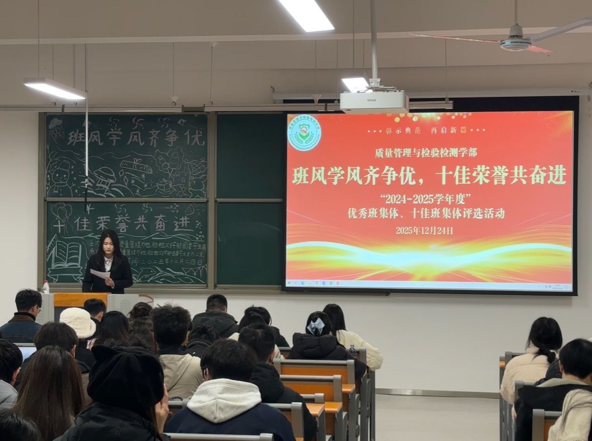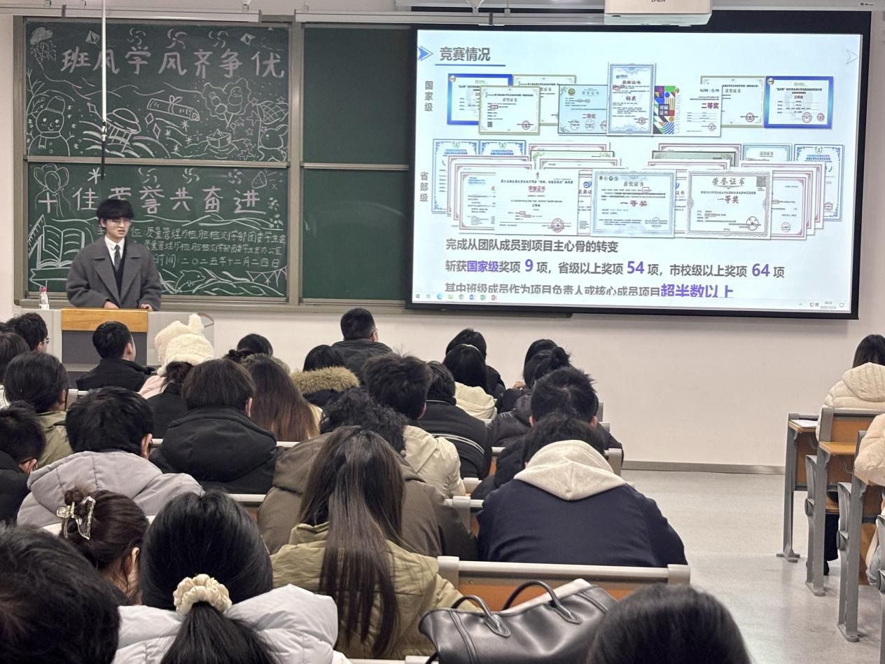 答辩环节中,各参评班级通过PPT展示和现场演讲,全面展示了班级在思想建设、学风营造、文体活动、社会实践以及凝聚力等方面的突出成果。评审团针对展示内容进行了提问与点评,观摩同学认真聆听,现场学习氛围浓厚。经综合评审,2023级4班、2023级3班、2023级2班、2024级4班被推荐为2024-2025学年度优秀班集体;2023级4班被推荐至学校参与十佳班集体评选。