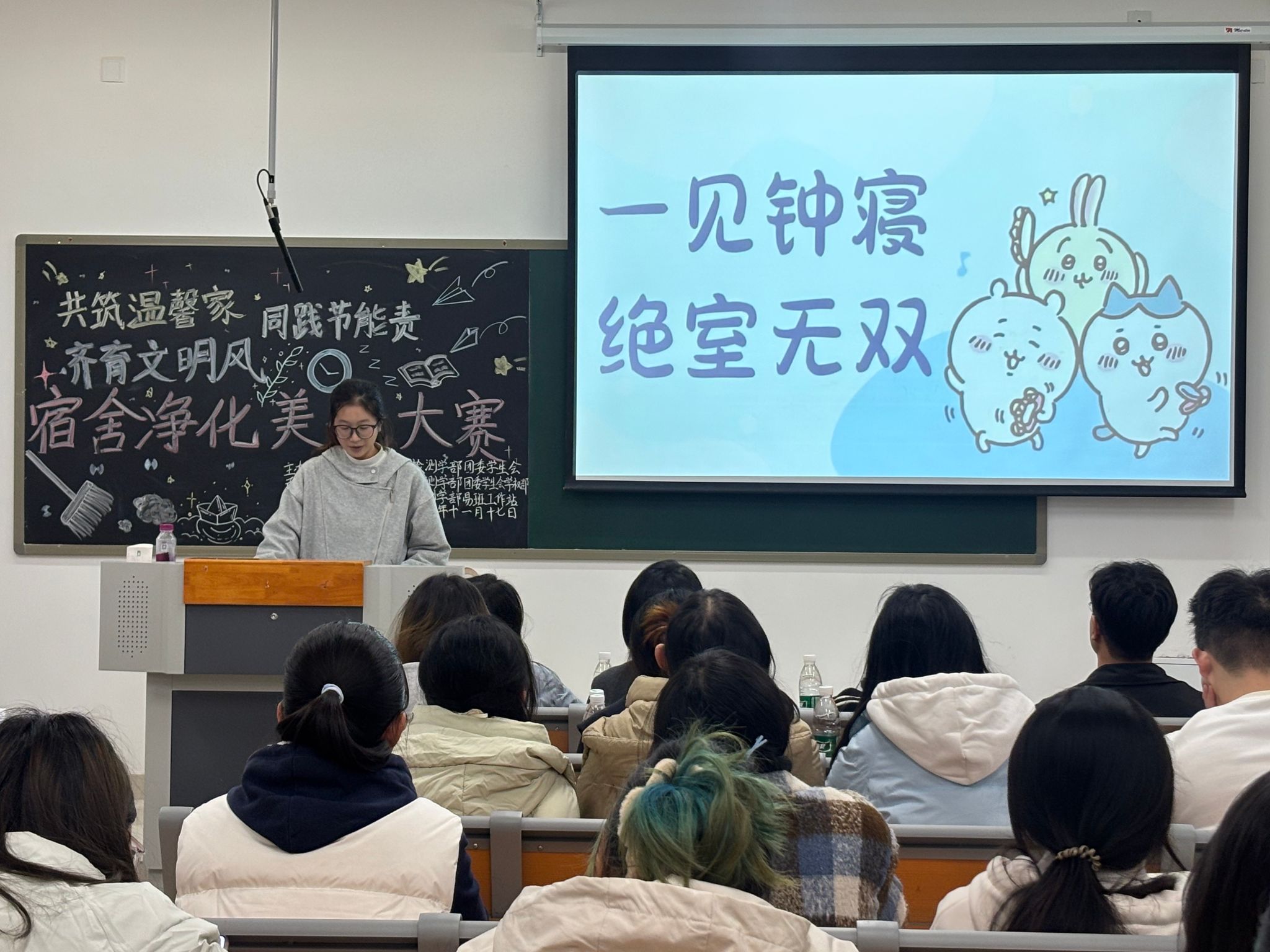 大赛全程分为三轮递进式环节,确保评选过程公平公正、全面多元。前期阶段,学部组建了由专兼职辅导员、团委学生会干部及易班工作站干部等人共同构成的实地考察评分小组,通过现场走访、细节核查、标准量化等方式,从宿舍整洁度、布置创意、节能措施、文明氛围等多个维度,对参赛寝室进行严格筛选与打分,最终评选出20间寝室进入易班投票与现场PPT展示环节。11月17日晚,晋级寝室齐聚线下展示现场,围绕“温馨布置、节能实践、文明风气”分享了“宿舍小家”。