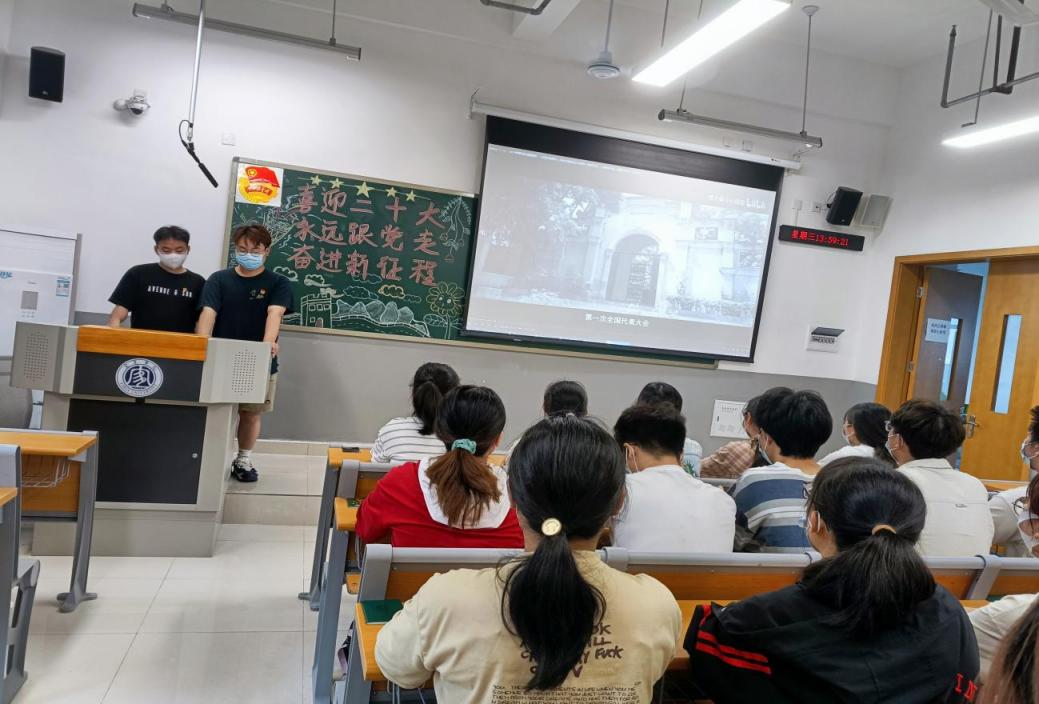 为了加强青年学子对民族复兴重任的担当、确立永远跟党走的初心、坚定奋进新征程的决心,质量管理与检验检测学部12个团支部于5月25日中午在A区硕勋楼和临港校区八号楼开展了以“喜迎二十大 永远跟党走 奋进新征程”为主题的团课学习活动。