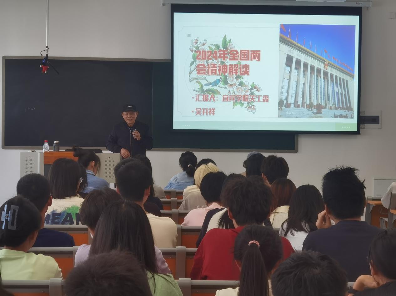 为了深入学习领会全国两会精神,近日,宜宾学院关工委到理学部、农林与食品工程学部、国际应用技术学部、质量管理与检验检测学部开展“2024年全国两会精神解读”主题讲座。宜宾学院关工委吴开祥教授、郑家华、肖希教授,理学部团总支副书记兼学办副主任马翠,质检学部团总支副书记兼学办副主任罗祥敏、专职辅导员黄小纤及四个学部学生代表参加讲座。讲座由吴开祥主讲。