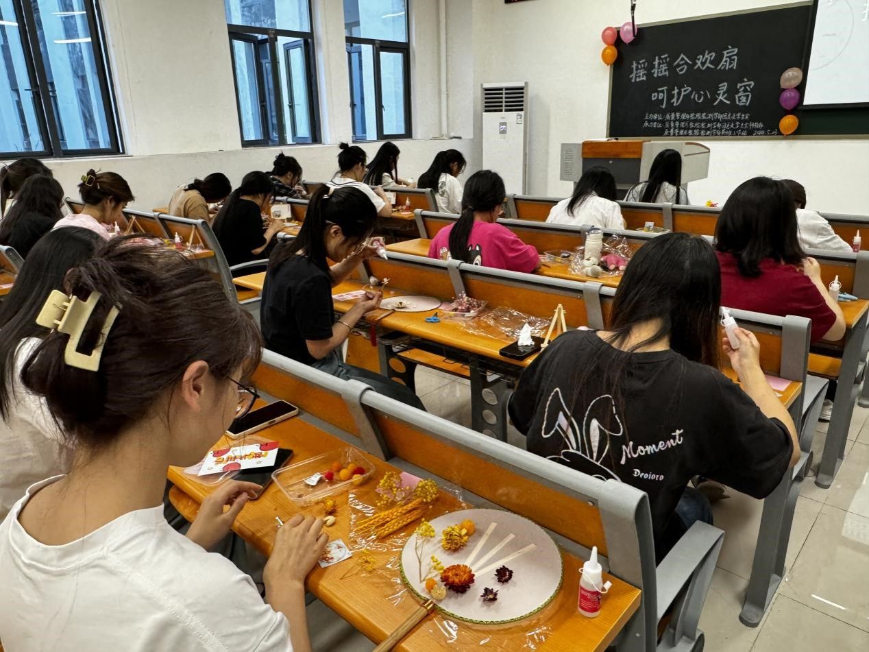 为了创新心理健康教育方法,探索“心育+美育”融合发展新模式,为学生提供一种舒缓压力和放松身心的有效途径,促进大学生心理健康,5月23日晚,质量管理与检验检测学部团总支学生会科技部与易班工作站共同举办“摇摇合欢扇,呵护心灵窗”手工团扇制作活动。