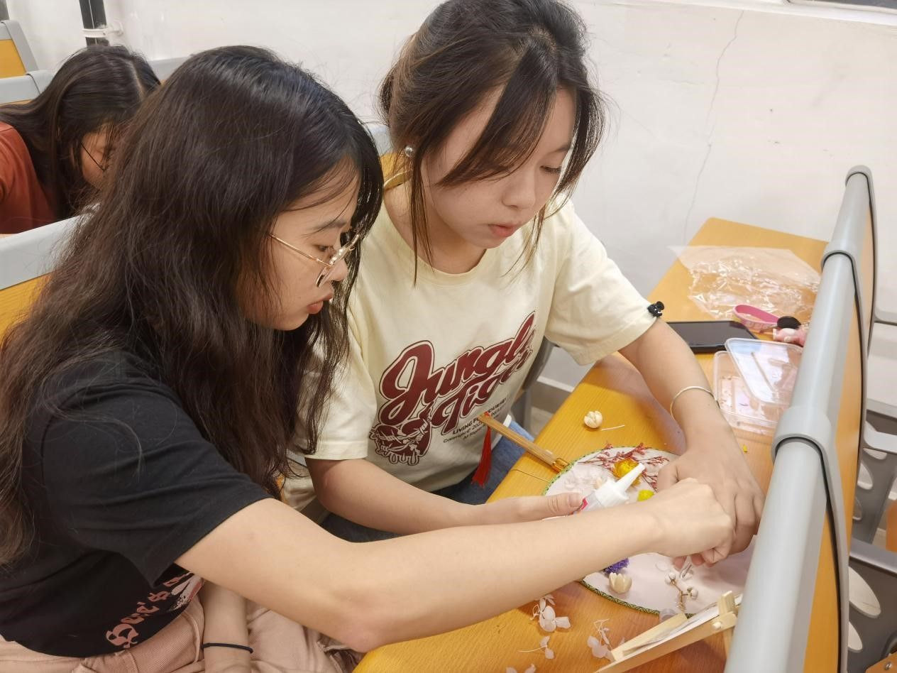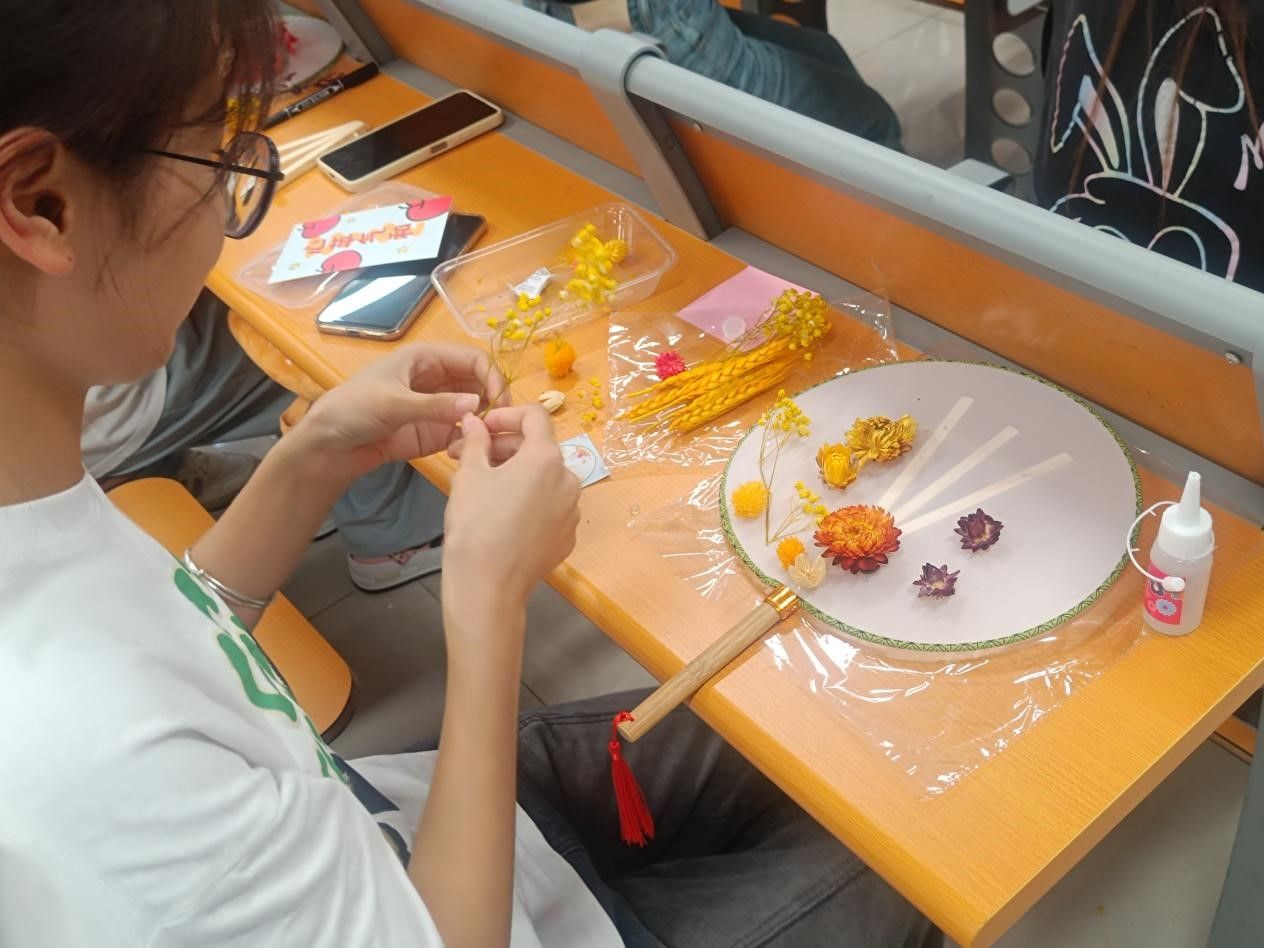活动负责人介绍规则后,同学们依次领取了制作材料,利用基础合欢扇、干花包、胶水等材料进行团扇DIY。在制作过程中,大家相互学习交流,既体验了幸福感与成就感,又增进了同学之间的交流,充分体现了活动的意义。