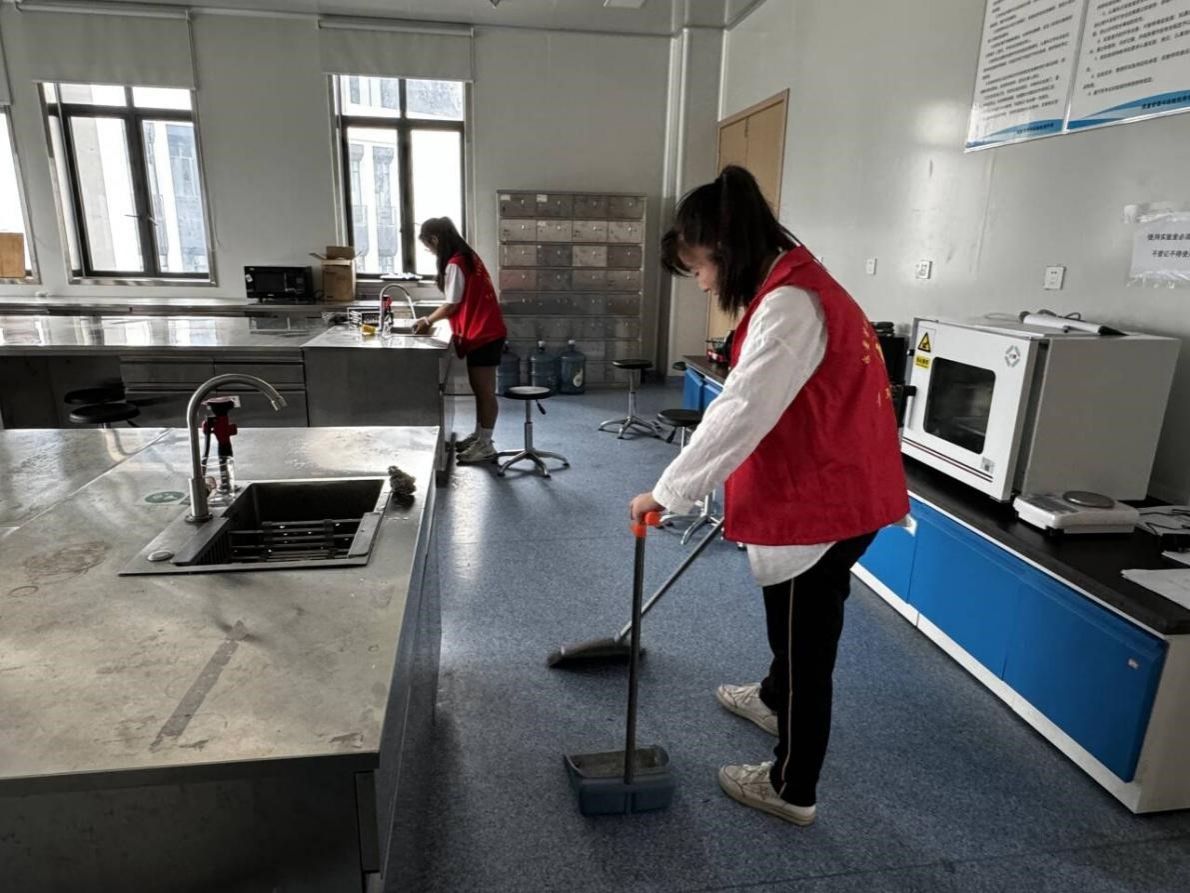 本次义务劳动活动主要打扫1楼、3楼的实验室以及2楼的教室,共计30余间。在学生干部的带领下,活动有序进行,志愿者们领取劳动工具后迅速投入工作,在劳动过程中,志愿者们热情高涨,干劲十足,相互帮助,齐心协力,将实验室和教室的卫生死角彻底清理干净。