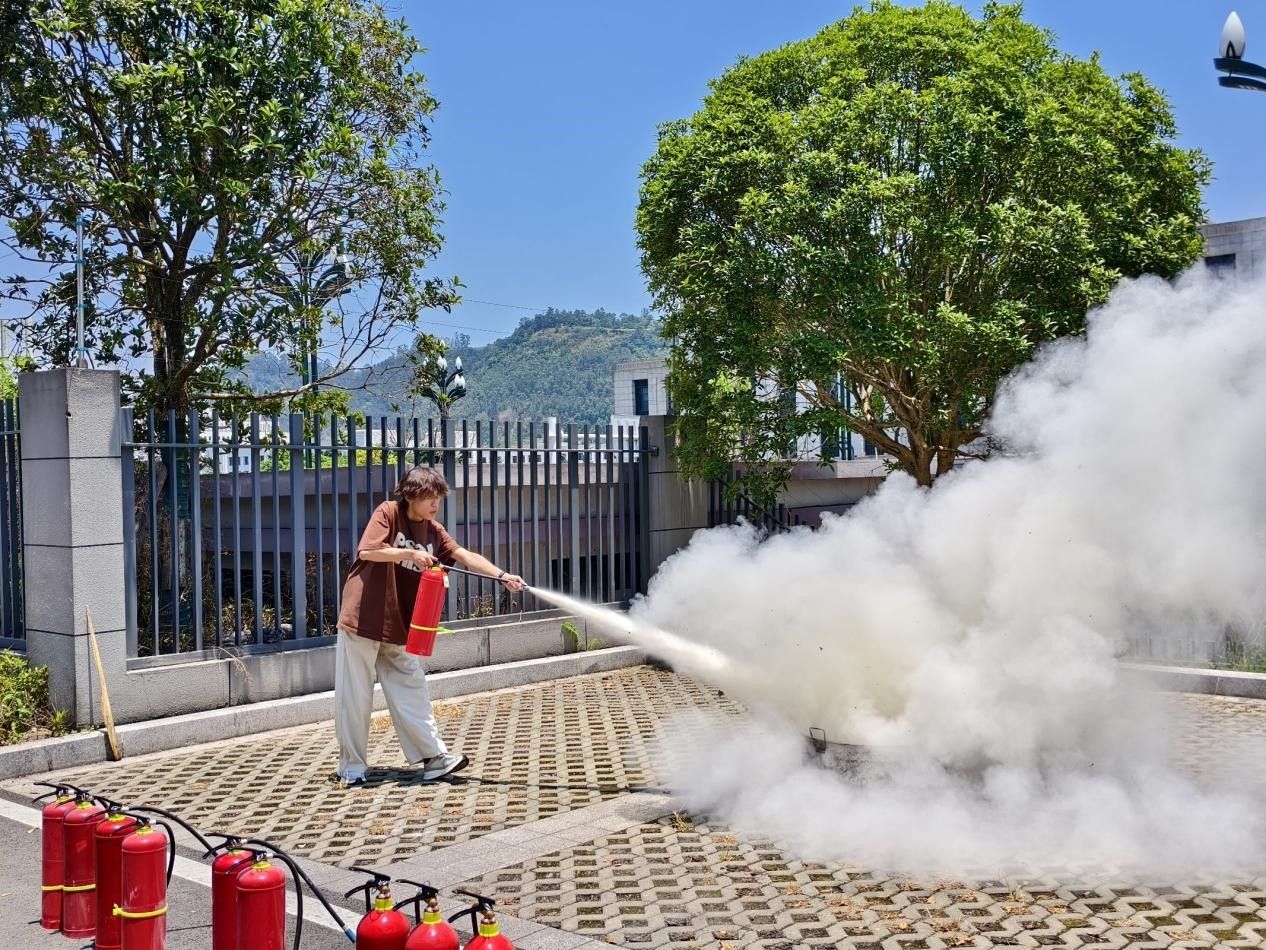 疏散演练后,全体人员转移至指定区域进行灭火器实操训练。安全专业学生现场演示干粉灭火器、二氧化碳灭火器、水基灭火器“一提、二拔、三握、四压”的操作要领,强调“对准火焰根部喷射”的操作要点以及过滤式自救呼吸器的正确佩戴方法。随后,全体师生轮番上阵进行实操训练,模拟扑灭初期火灾,进一步巩固了灭火技能。
