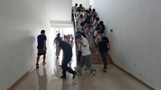 本次活动分为安全教育培训与消防疏散演练两大环节。演练前,学部制定了详尽方案,明确人员分工与应急流程,并设立培训现场服务组、疏散引导组、灭火救援组等专项小组,确保演练高效有序进行。学部实验室模拟突发火情,警报响起后,全体人员迅速按照预定路线有序撤离至安全区域。疏散过程中,疏散引导组第一时间打开安全通道,师生用湿毛巾捂住口鼻,低头弯腰有序撤离,整个过程用时2分50秒,充分展现了高效的应急反应能力。