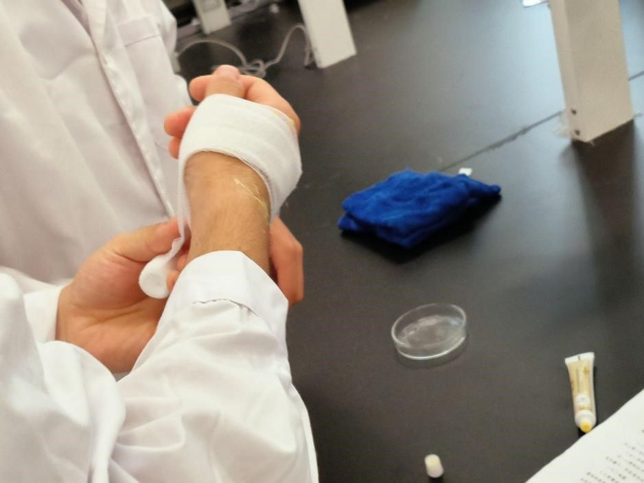 第五部分是高温烫伤事故应急演练,实验人员一模拟右手取样时被水浴锅高温烫伤(红肿、起水泡)。现场发现人员二发现情况后立即用医用药棉将伤者患处水蘸干,然后在烫伤处涂烫伤膏,最后用医用纱布包扎好。