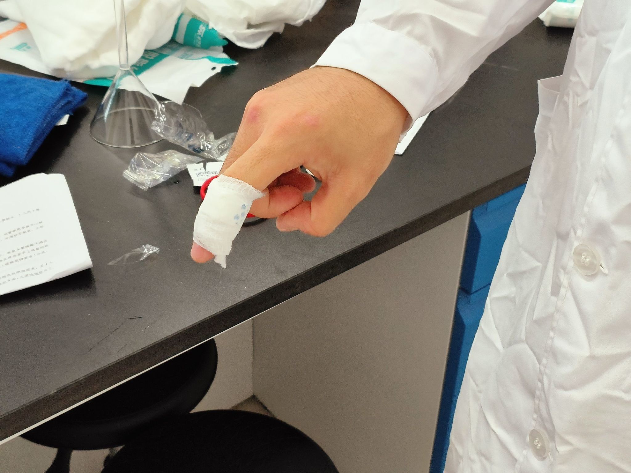 第二部分是玻璃划伤事故应急演练。实验人员一模拟使用玻璃器皿(试管)时,试管破裂导致手被划伤流血。现场发现人员二发现情况后立即帮助受伤人员用大量清水冲洗伤口,然后使用碘伏消毒,最后用纱布包扎伤口,受伤严重时立即送医。